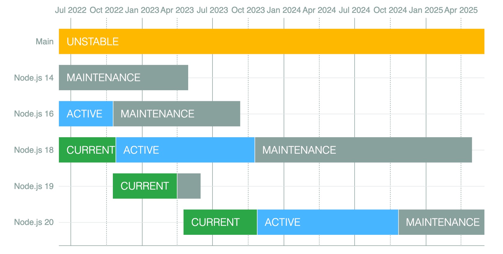 LTS 팀에서 검토한 새로운 기능, 버그 수정 등이 포함된 버전입니다. 기능이나 수정사항이 적절한지 판단이 되고 안정적이라는 것이 확인이 된 경우 포함이 됩니다. 또한 버전을 유지하는 기간도 깁니다. 18.x 버전의 경우 2022-04-19에 시작을 해서 2025-04-30까지 버전을 관리합니다. 상용 소프트웨어를 개발하는데 사용하기 적적한 버전입니다. 참고로 LTS 버전은 짝수로 되어 있습니다. 홀수 버전은 LTS 버전으로 승격이 되지 않습니다.