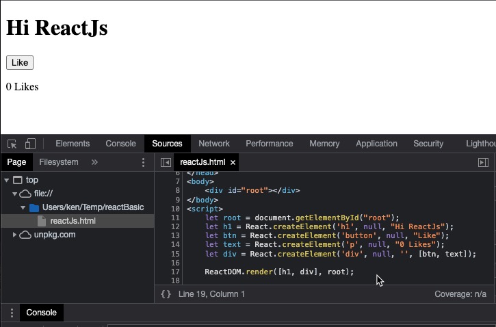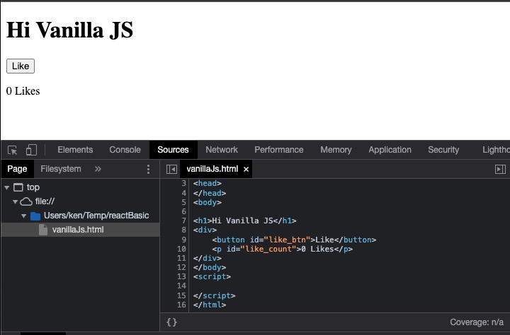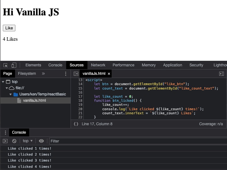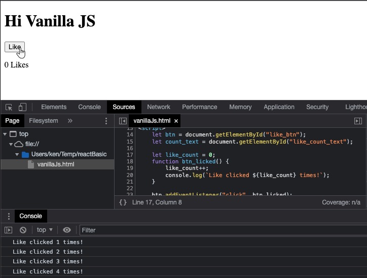 리엑트를 처음 배우는 분이라면 이미 기본적인 자바스크립트(Vanilla Javascript)는 사용할 줄 아실 텐데요. 본격적으로 리엑트 에이에스(ReactJs)를 배우기 전에 코드 예제를 통해서 바닐라 자바스크립트와 리엑트 제이에스가 어떻게 다른지를 살펴보는 것은 두고두고 도움이 되는 좋은 경험이 될 겁니다. 먼저 간단한 자바스크립트로 버튼이 클릭될 때마다 Like 숫자를 하나씩 올려주는 html 페이지를 하나 만들어 보겠습니다. 그다음에 동일한 동작을 하는 ReactJs 코드를 작성하려고 합니다.
