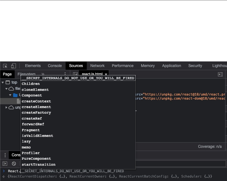 이렇게 파일을 추가하면 React 오브젝트와 ReactDOM 오브젝트를 사용할 수 있게 됩니다. 콘솔에서 React. 을 타이핑해 보세요. 그러면 아래와 같이 사용할 수 있는 함수 목록이 나옵니다. 콘솔에서 ReactDOM. 도 타이핑해 보세요.